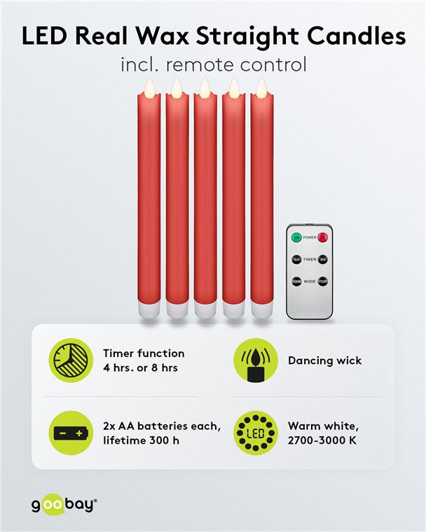 5er-Set rote LED-Echtwachs-Stabkerzen, inkl. Fernbedienung