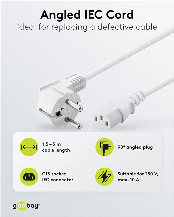Abgewinkeltes Kaltgeräte-Anschlusskabel, 3 m, Weiß, (3*1 mm²)