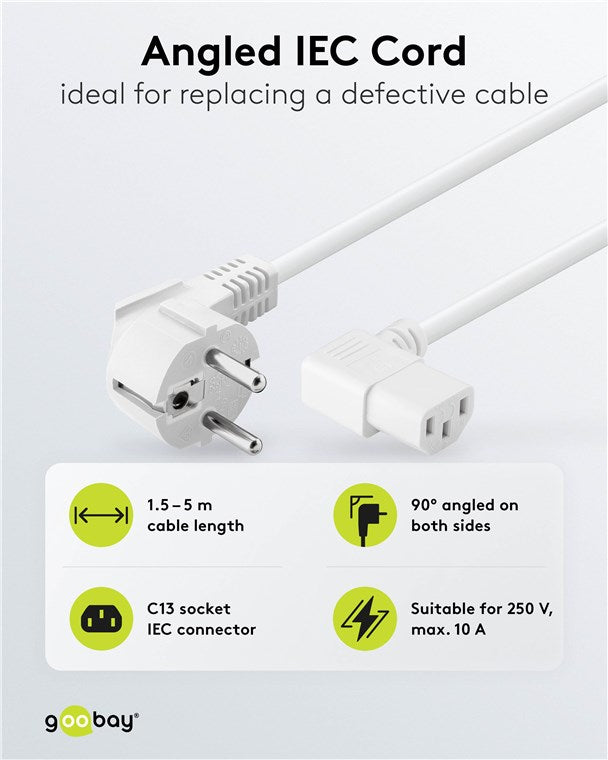 Beidseitig abgewinkeltes Kaltgeräte-Anschlusskabel, 2 m, Weiß, (3*0,75 mm²)