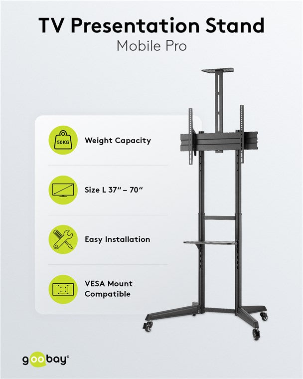Mit 4 Rollen ist das Gerät mobil und für den Einsatz von Fernsehern zu Hause, in Büros oder auf Konferenzen prädestiniert. Zwei arretierbare Rollen sorgen dabei für sicheren Stand. 4 Höhenniveaus der Montageplatte und werkzeugloses Neigen ermöglichen eine optimale Einstellung des Ständers. Die höhenverstellbare Kameraablage bietet eine ideale Lösung für Telefonkonferenzen.