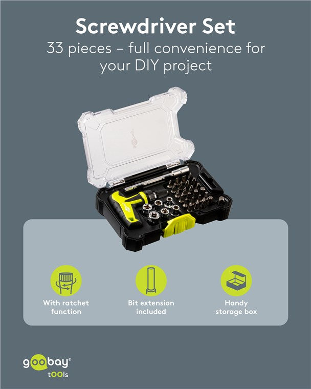 Jedes Bit ein Hit: Das Schraubenzieher-Set überzeugt mit T-Bithalter, dem Steckschlüsselsatz und der handlichen Transportbox. Die T-Ratsche sorgt für extremen Komfort und optimierte Kraftübertragung beim Schrauben. Durch die spezielle Form mit gummierten Ecken und einem robusten Verschluss ist die Box besonders widerstandsfähig. Der Clou: Die Boxen der Produktserie sind übereinander stapelbar. Cleveres Design, sicherer Transport.