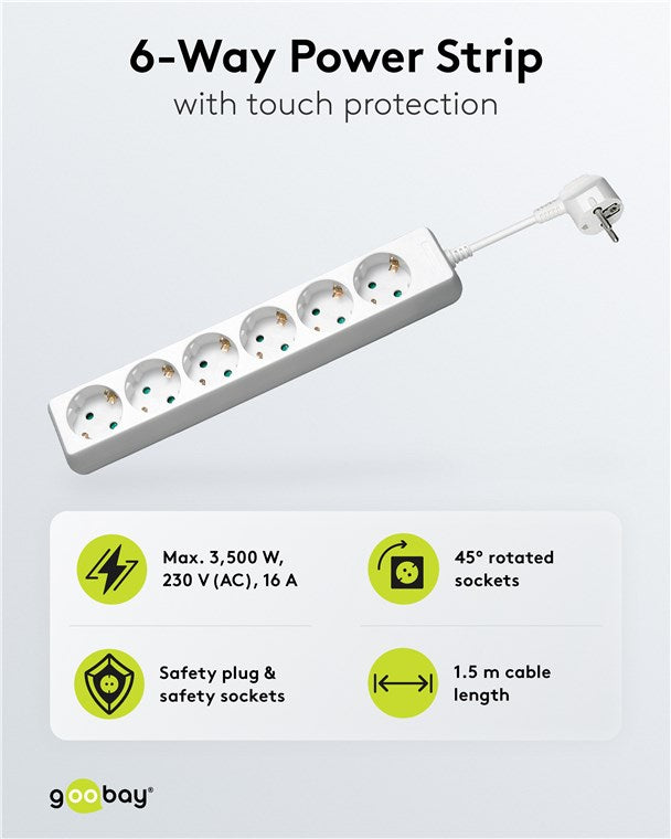 6 yollu uzatma kablosu, 1,5 m, beyaz